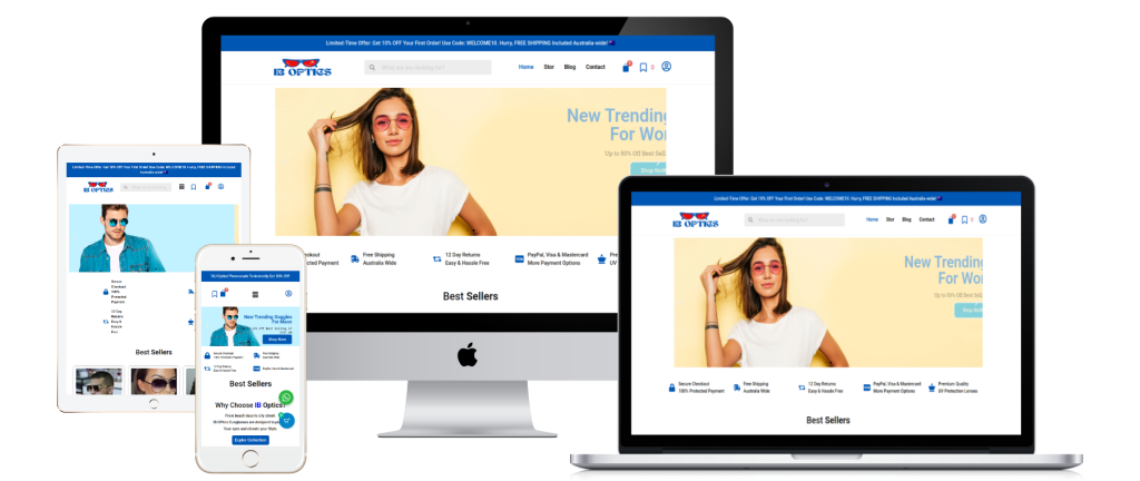 The site is fully responsive, ensuring a pixel-perfect look on desktops, tablets, and mobile devices. By combining sleek UI/UX design with technical logic and AI-driven custom CSS, IB Optics stands as a high-performing digital storefront ready for global scales.”